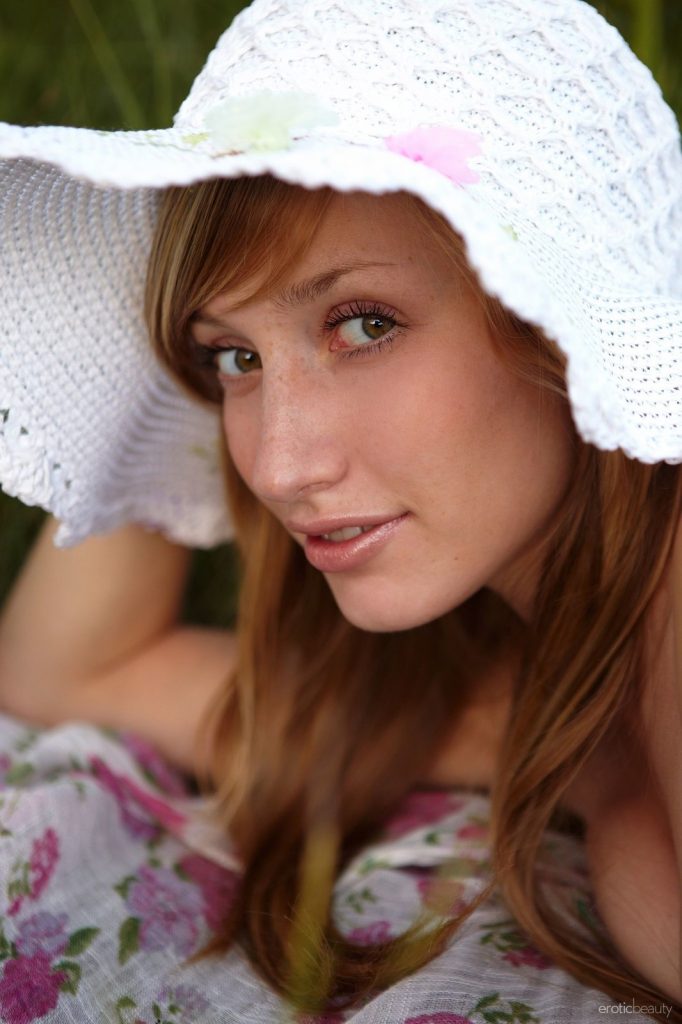 Blondi w kapeluszu ma słodki paseczek z włosów łonowych nad muszelką. Cudowna porno modelka zdejmuje sukienkę, siada na niej i daje sobie z palca. Zgrabna dziewczyna z kolczykiem w pępku lubi masturbować się na łonie natury.