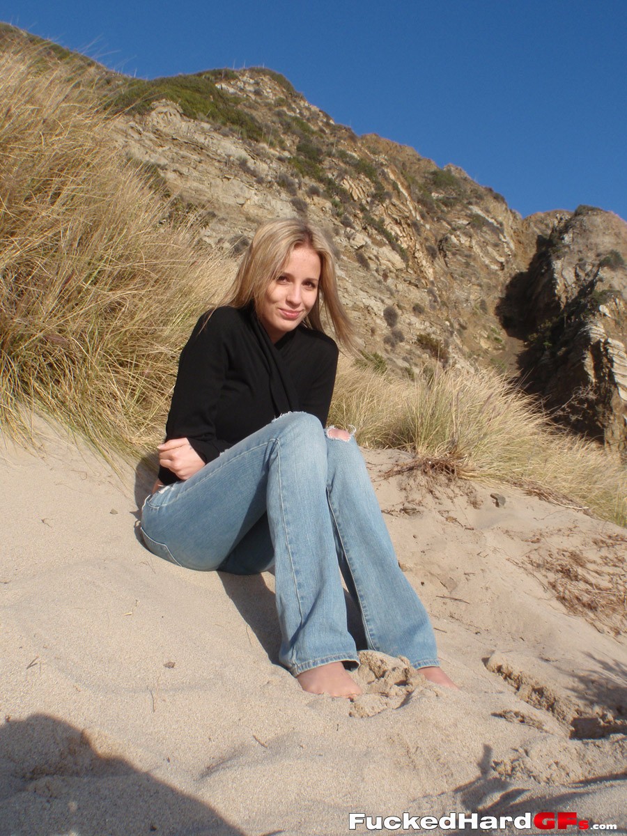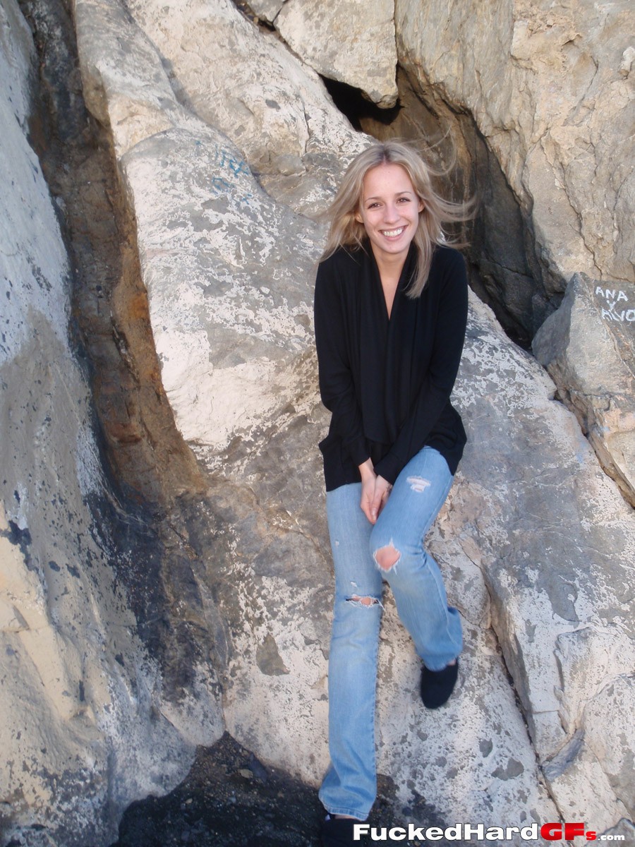 Piękna blondyneczka na łonie natury ubrana w czarny sweterek, szarą bluzkę i dżinsy. Blondynka na wielkich skałach powoli odsłania swoje szczupłe piękne ciałko. Na piasku laseczka rozkłada aparat i robi sobie sesje zdjęciową ciasnej wydepilowanej szpareczki