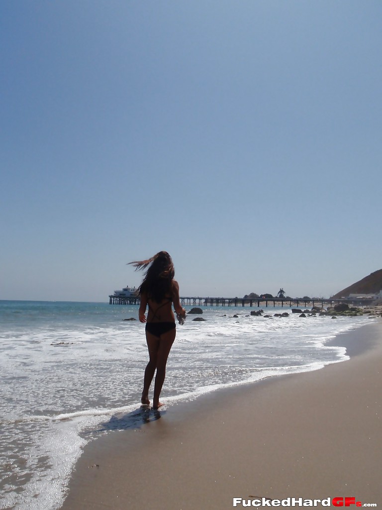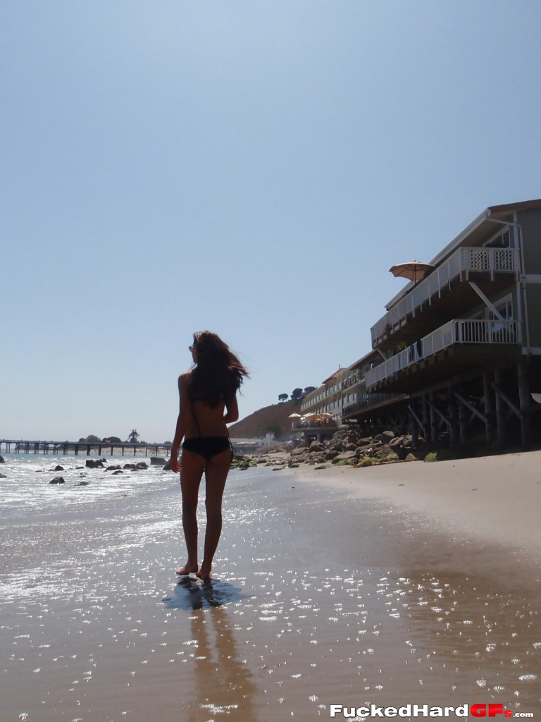 Piękna brunetka ubrana w seksowne czarne bikini i okulary słoneczne. Laseczka schodzi z plaży i w spokojnym miejscu powoli odsłania swoje seksowne ciałko, jędrne cycuszki, soczystą zgrabną dupeczkę i wydepilowaną cipkę. Laseczka za kasę pewnie zrobiła by coś więcej