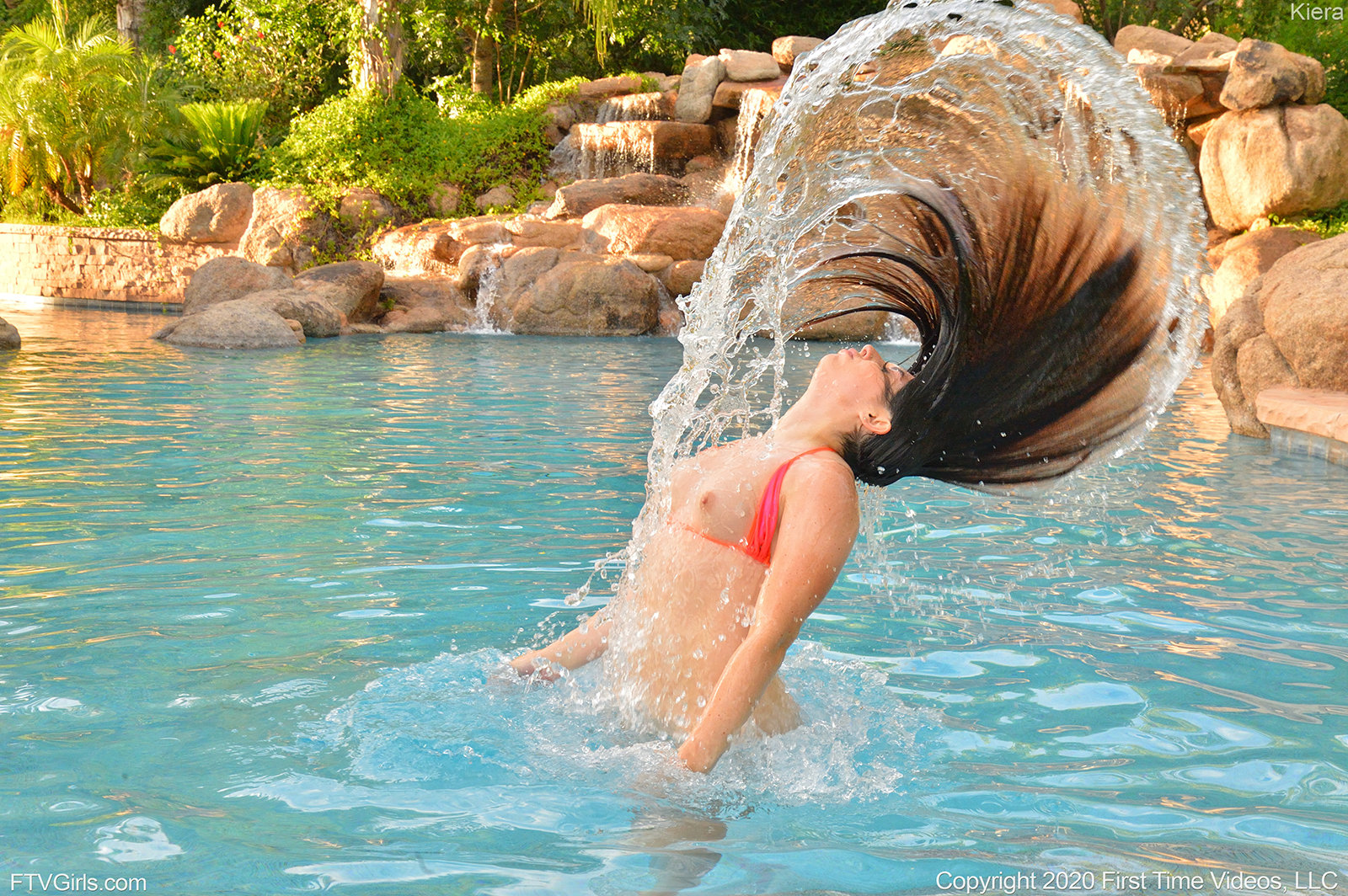 Brunetka w bikini schładza swe ciałko w wodospadzie. Piękna dziewczyna jest ogromną fanką dzikiego seksu. Gdy nie ma faceta pod ręką ogląda ostre porno i robi sobie dobrze ulubionymi wibratorami. Naturalnie krągła laseczka wypina ogromne pośladki.