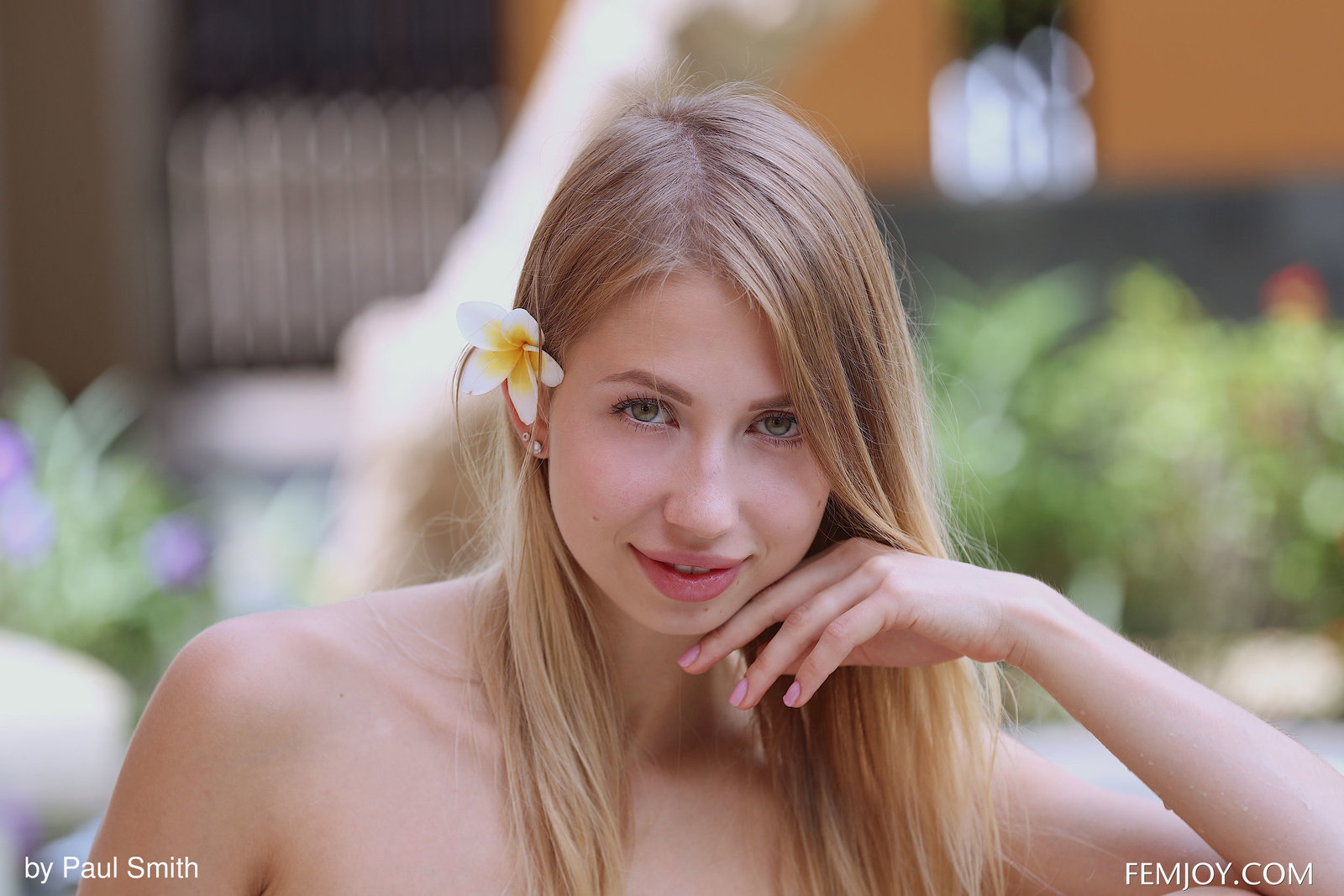 Słodka babeczka z kwiatkiem we włosach robi seksowny pokaz przy basenie pod gołym niebem. Kusząca laseczka ma małe cycki i wygląda uroczo w prześwitujących majteczkach. Chudziutka laska rozbiera się do naga i robi sobie dobrze podczas seks wakacji.
