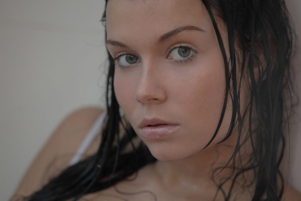 Mokra bogini seksu ma na sobie mokre i prześwitujące majteczki. Zmysłowa i naturalnie krągła brunetka ma duże piersi i prześliczne oczka. Czarnowłosa modelka lubi się ostro masturbować pod natryskiem. Mokre ciałko napalonej ślicznotki.