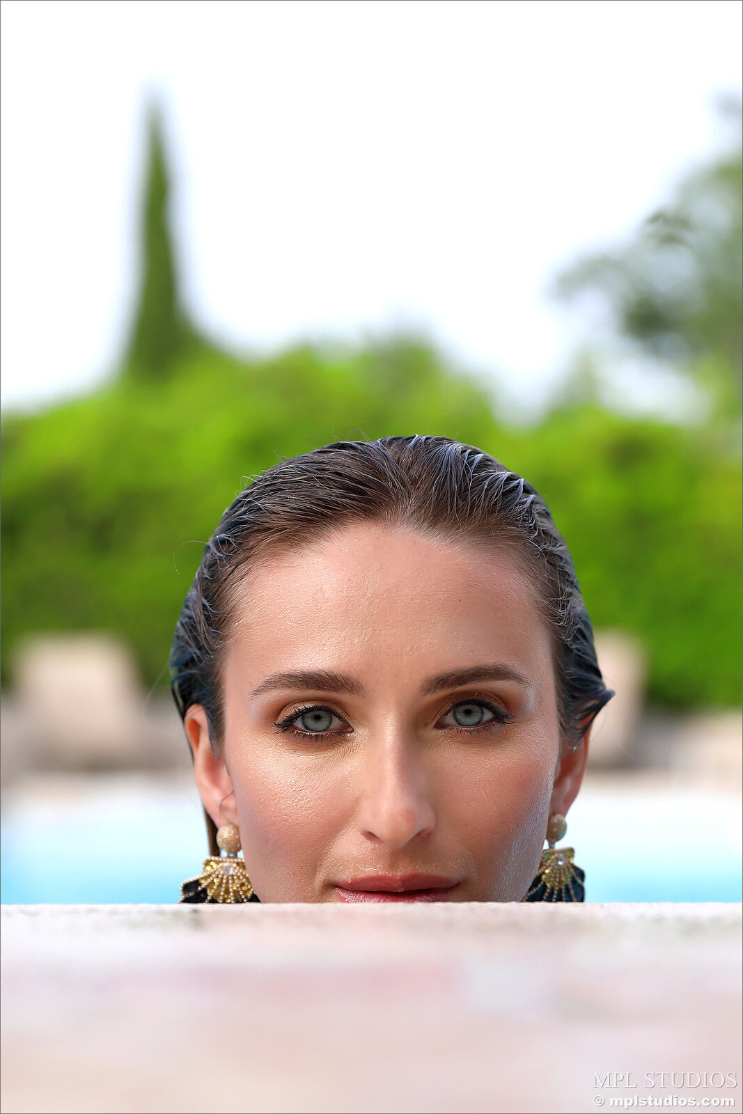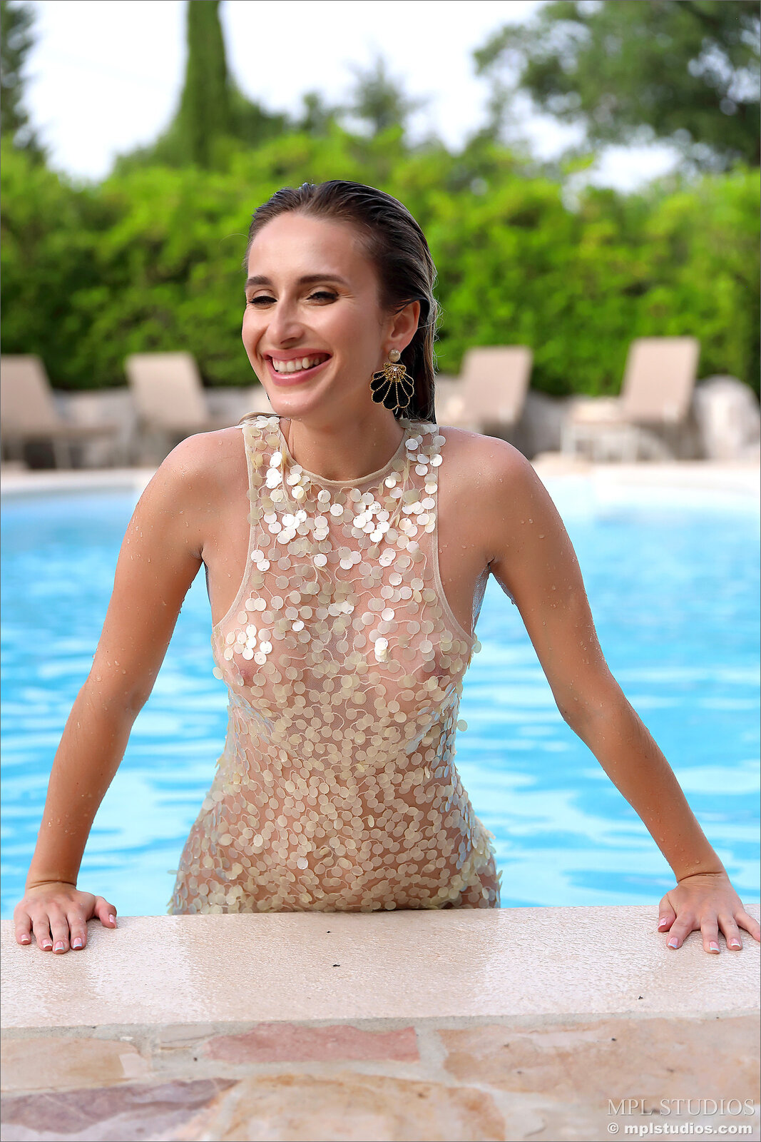 Przesłodka porno blondynka z elegancko przystrzyżoną pipką schładza gorące nóżki w basenie pod gołym niebem. Przyrumieniona laseczka ma niebieskie oczka i zniewalające spojrzenie. Mokra niewiasta ma sterczące sutki z podniecenia.Ã?Â