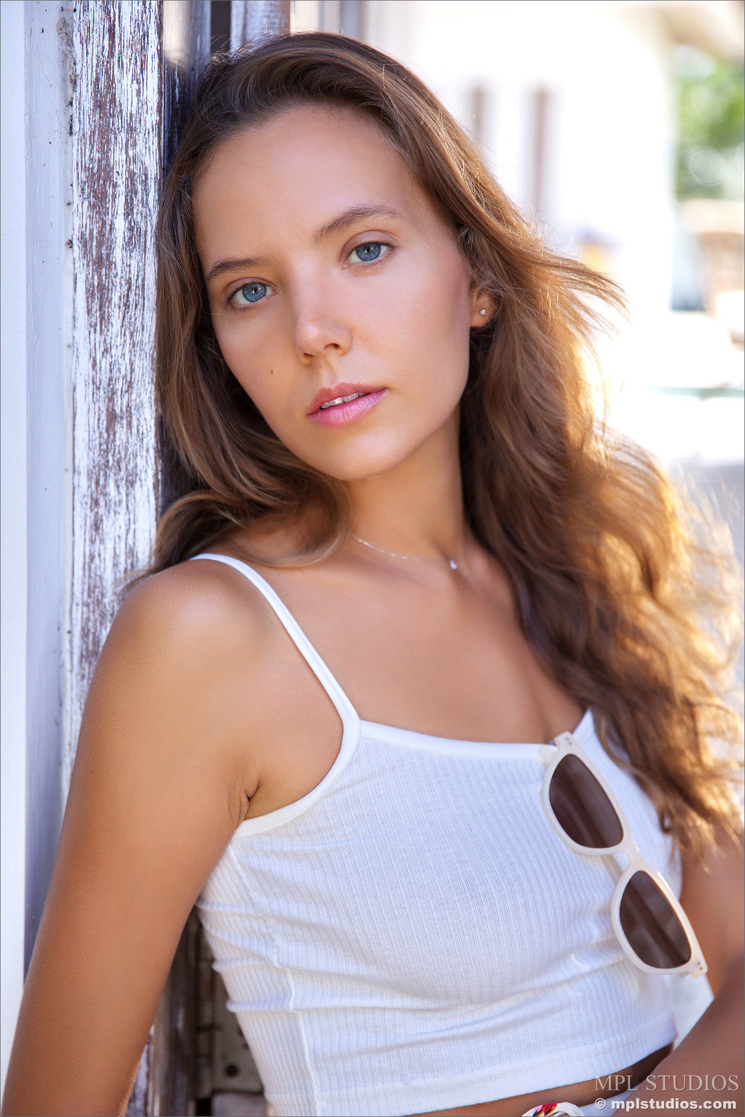 Niebieskooka kocica podwija ciuszek i pokazuje duże cyce fotografowi. Naturalna modelka w białych szpilkach lubi gdy faceci spoglądają w jej dekolt. Urocza laseczka ma ochotę na chwileczkę zapomnienia. Kto chętny na szybki seks z przepiękną lalunią?