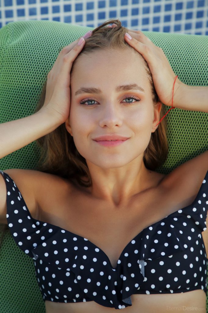 Seksowna niunia w bikini robi sobie dobrze w basenie. Erotyczna lalunia ma różowe, całuśne usta i niebieskie oczka. Laseczka ze sterczącymi stukami ma naturalne cyce. Panienka rozbiera się do naga i pieści ciasna cipkę na dmuchanym materacu.