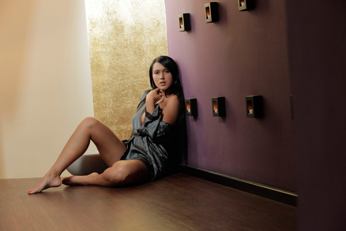 Opalona brunetka wgląda mega seksownie w szlafroku. W stu procentach naturalna ślicznotka wyciąga duże cycki na wierzch i bawi się nimi. Czarnowłosa kobieta z kolczykiem w pępku lubi gdy faceci podniecają się na widok jej sex fotek.Ã?