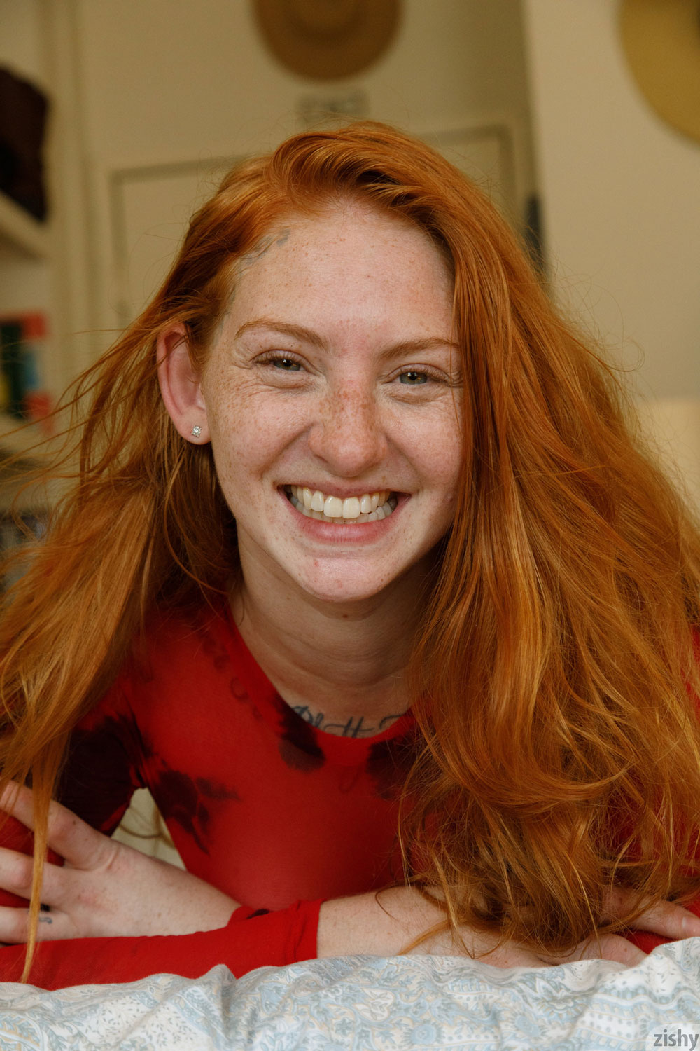 Piegowata lisica ma na sobie prześwitującą bluzeczkę i czarne majteczki. Ruda laska uwielbia tatuaże, ma ich wiele na swoim ciele. Zwariowana suczka ma nawet tatuaż na czole. Niegrzeczna dwudziestolatka lubi się ostro zabawić gdy nikt nie patrzy.