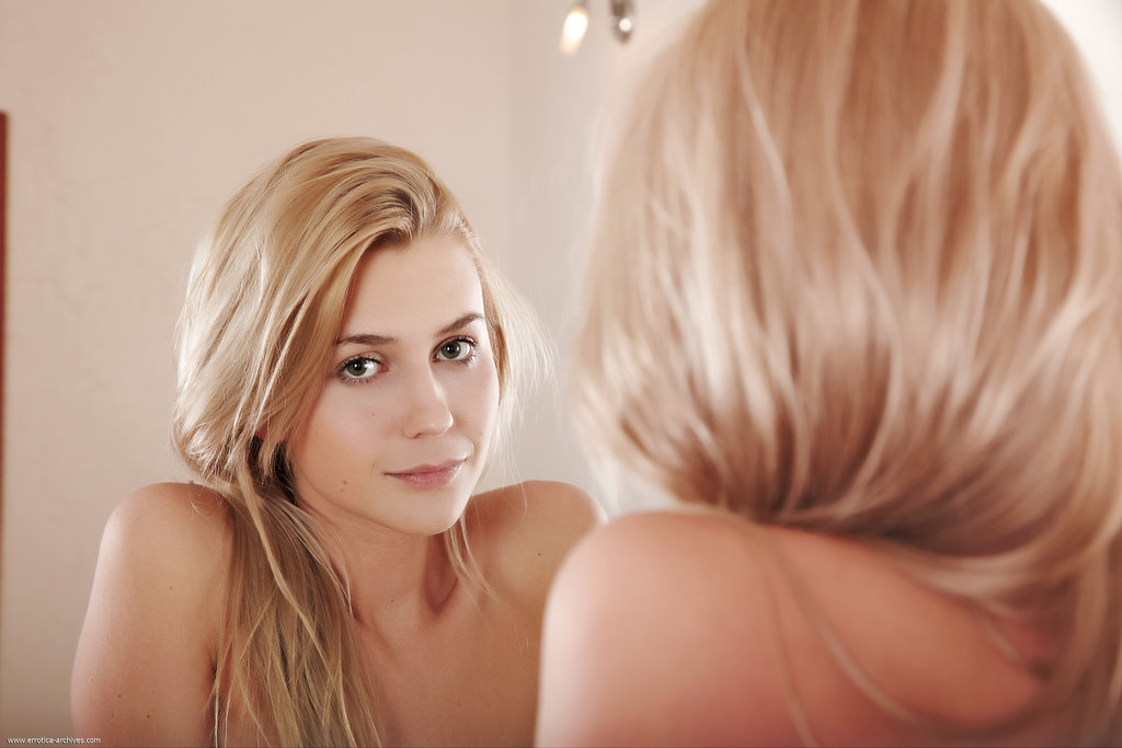 Piękna księżniczka siada na taborecie i pieści jędrne cycuszki przed lustrem. Młoda porno modelka lubi gdy facet liże ją po analnej dziurce i pieści paluszkiem wydepilowaną muszelkę. Złotowłosa ślicznotka ma zgrabny tyłek i niewielki biust.Ã?