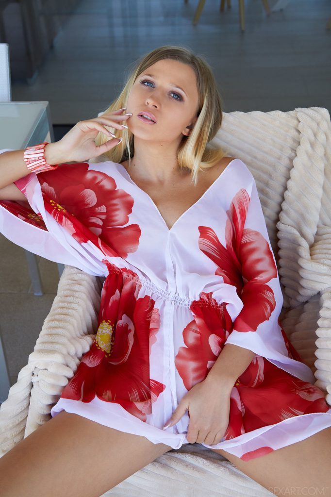 Cudowna laseczka ma prześliczne oczy i małe, różowe usteczkach. Erotyczna sex blondynkaÃ? w srebrnych szpilkach siada na krześle, rozkłada nóżki i delikatnie się masturbuje. Fajna dziewczyna ma ochotę na delikatny seks na tarasie.