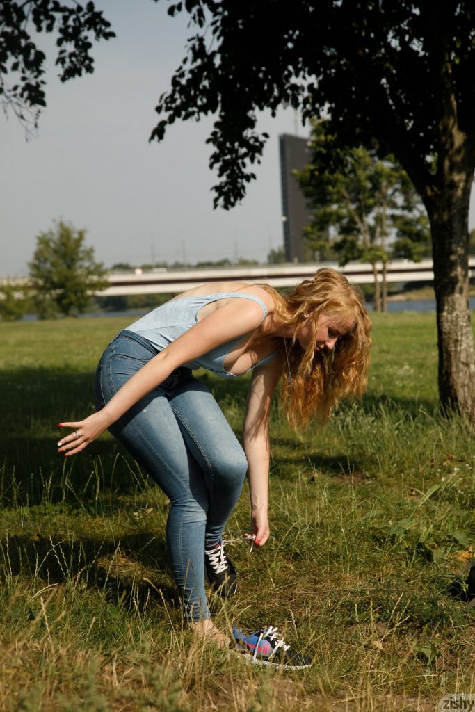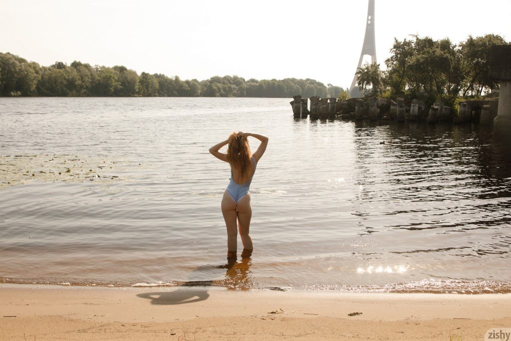 Seksowna i nieco skromna laseczka prezentuje boskie piersi w publicznych miejscach. Szalona i mega naturalna modelka ma obfite cycuszki. Wesołka kotka w jednoczęściowym stroju kąpielowym schładza swoje ciałko w jeziorze.