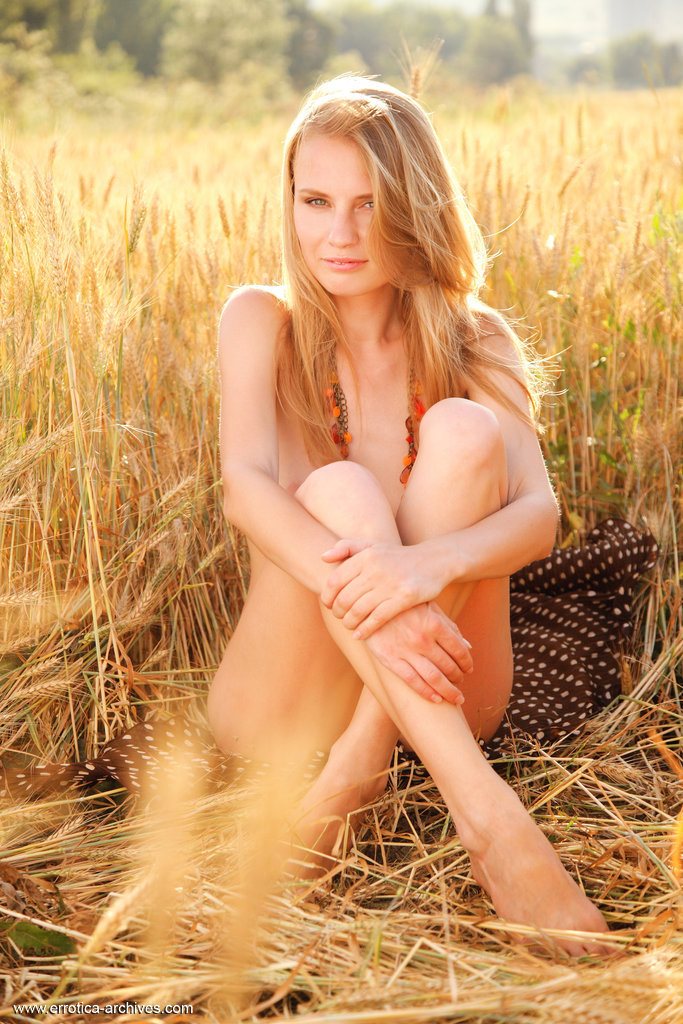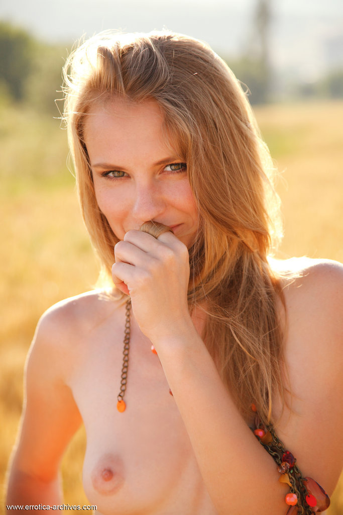 Szczupła, długonoga laseczka robi seksowny striptiz na polu. Kusząca blondyneczka zdejmuje sukienkę, siada na niej i delikatnie pieści ciasną cipkę paluszkiem. Zgrabna panienka wypina dupcię po gołym niebem i ma ochotę na szybki seks na pieska.