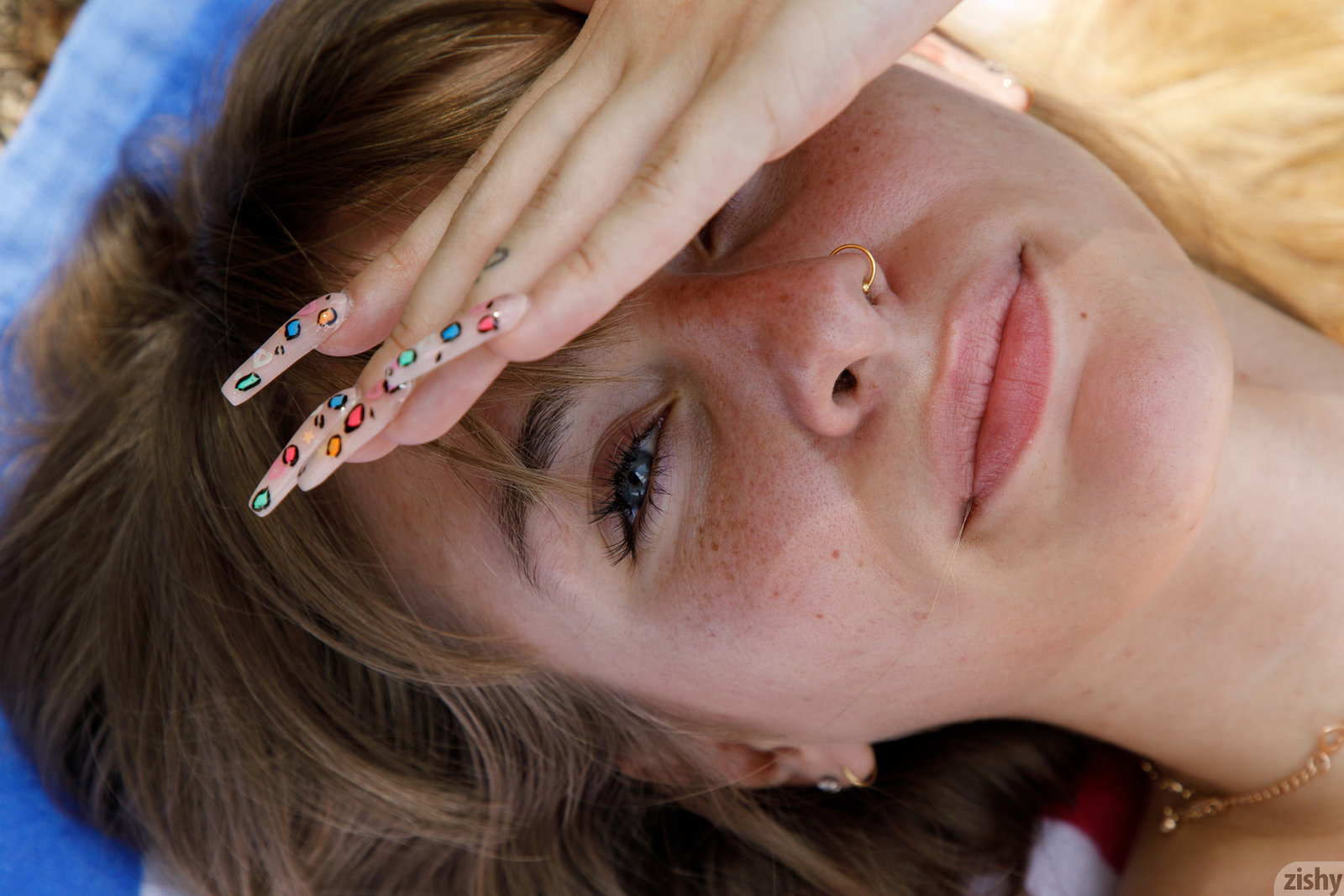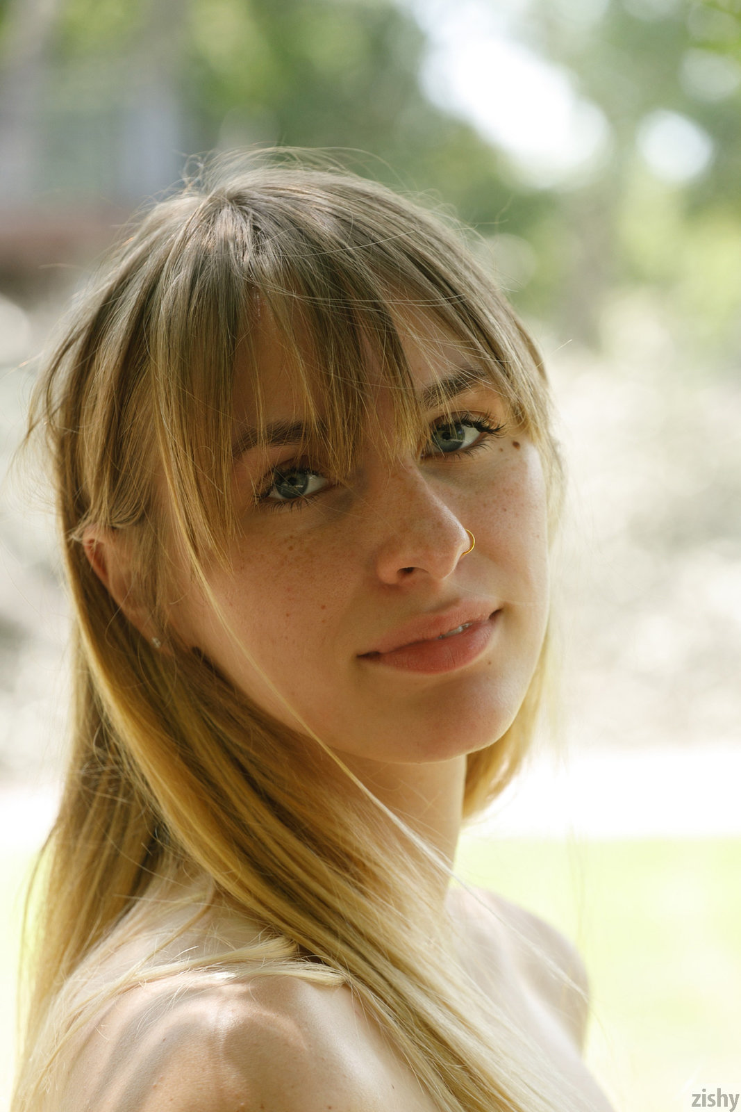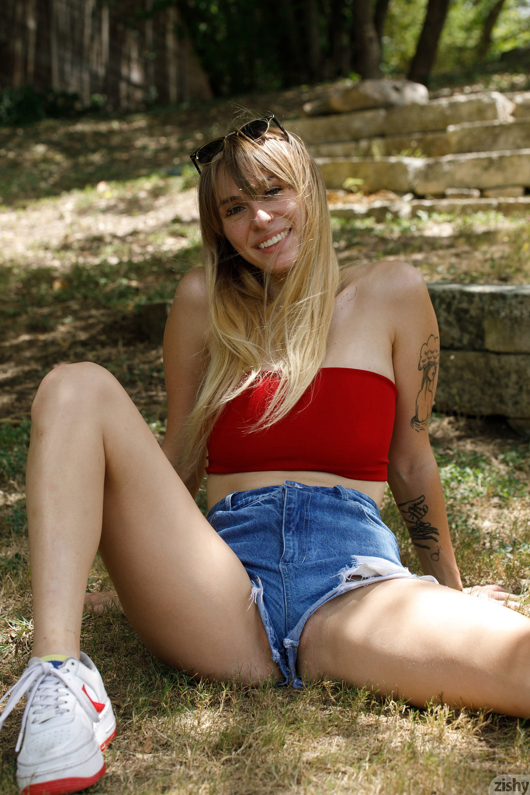 Seksowna laseczka robi striptiz nad stawem i prezentuje wielkie cyce. Kusząca dziewczyna z przesłodkim uśmiechem ma krągłe dupsko i naturalny biust. Zrelaksowana laseczka pieści się delikatnie pod gołym niebem. Niunia wygląda bosko w czarnych majteczkach.