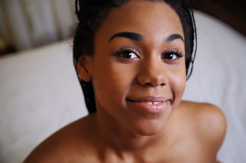 Uśmiechnięta murzynka w białej bieliźnie wije się z podniecenia na łóżku w sypialni. Erotyczna czekoladka ma duże, całuśne usta i piękne oczka. Wesoła czekoladka zdejmuje staniczek i bawi się sterczącymi sutkami. Mulatka ma ochotę na seks.
