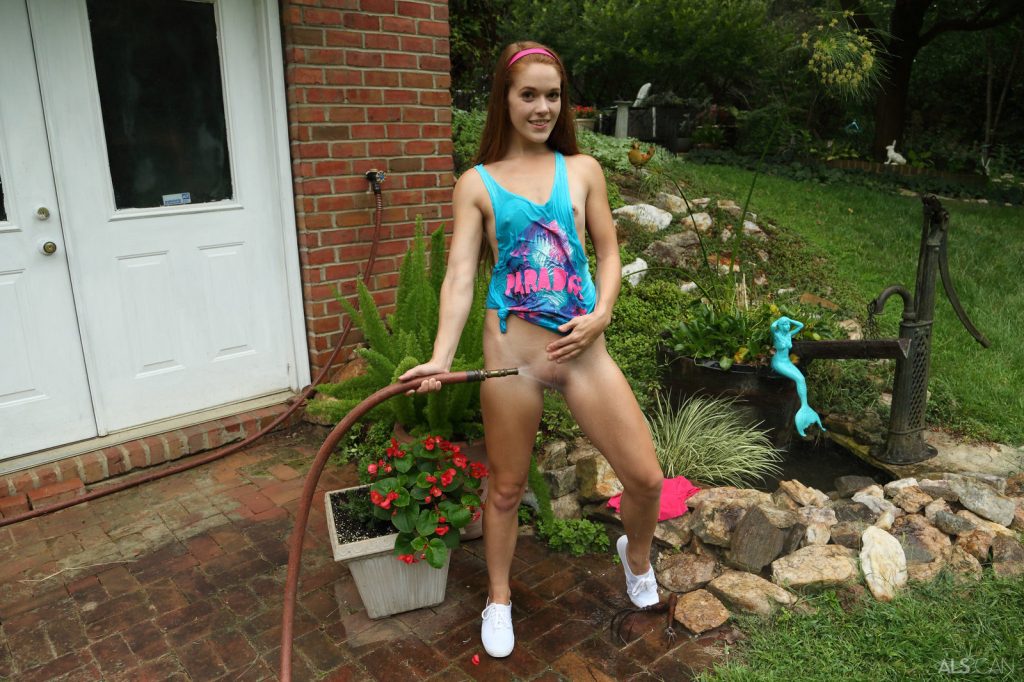 Ruda laseczka polewa swą gorącą cipkę zimną wodą w ogrodzie. Erotyczna dziewczyna ma zgrabne nóżki i niewielki biuścik. Fajna laska wypina swe pośladki pod gołym niebem. Młoda studentka lubi sobie dogodzić w ogrodzie jej dziadków.